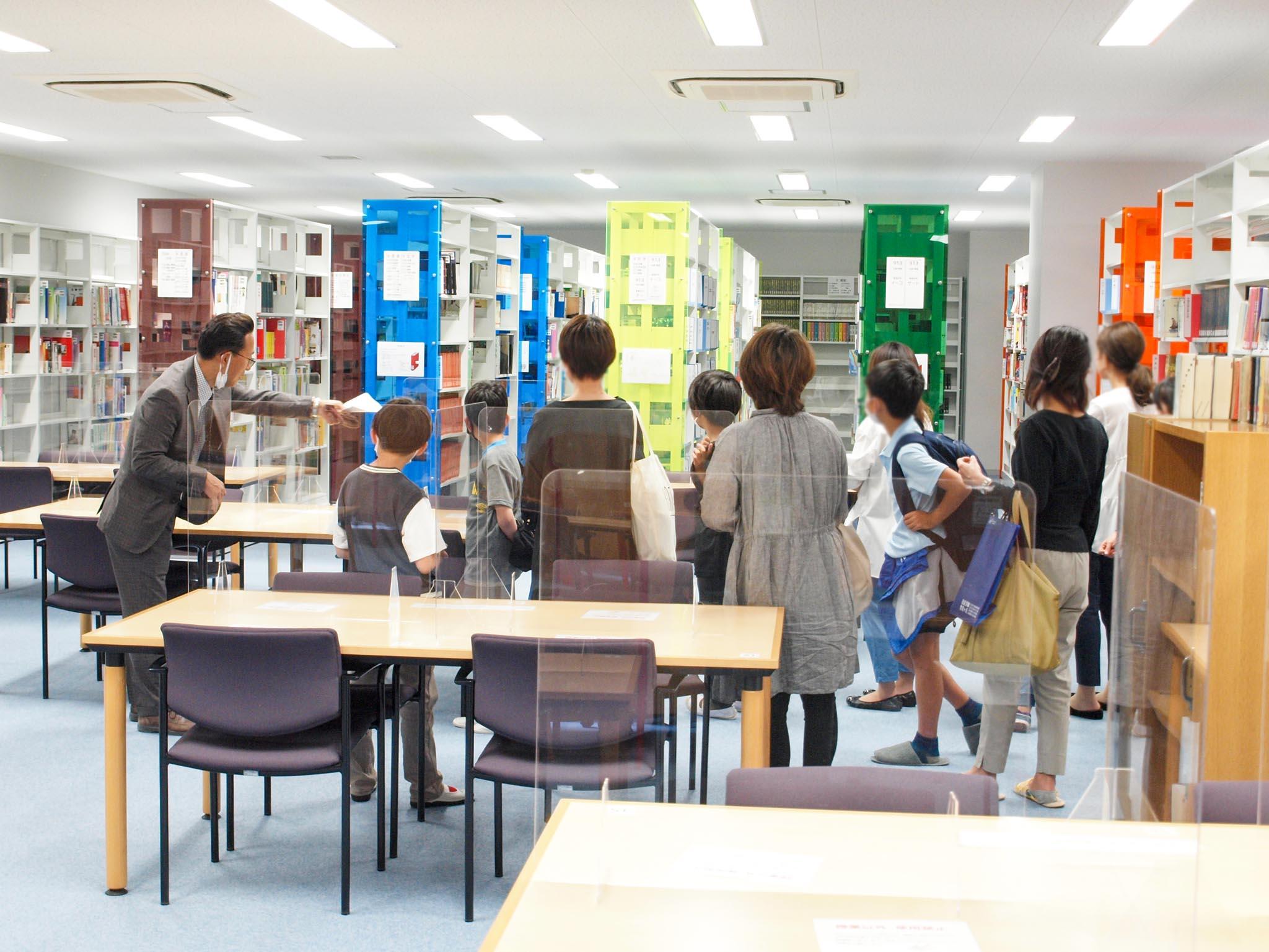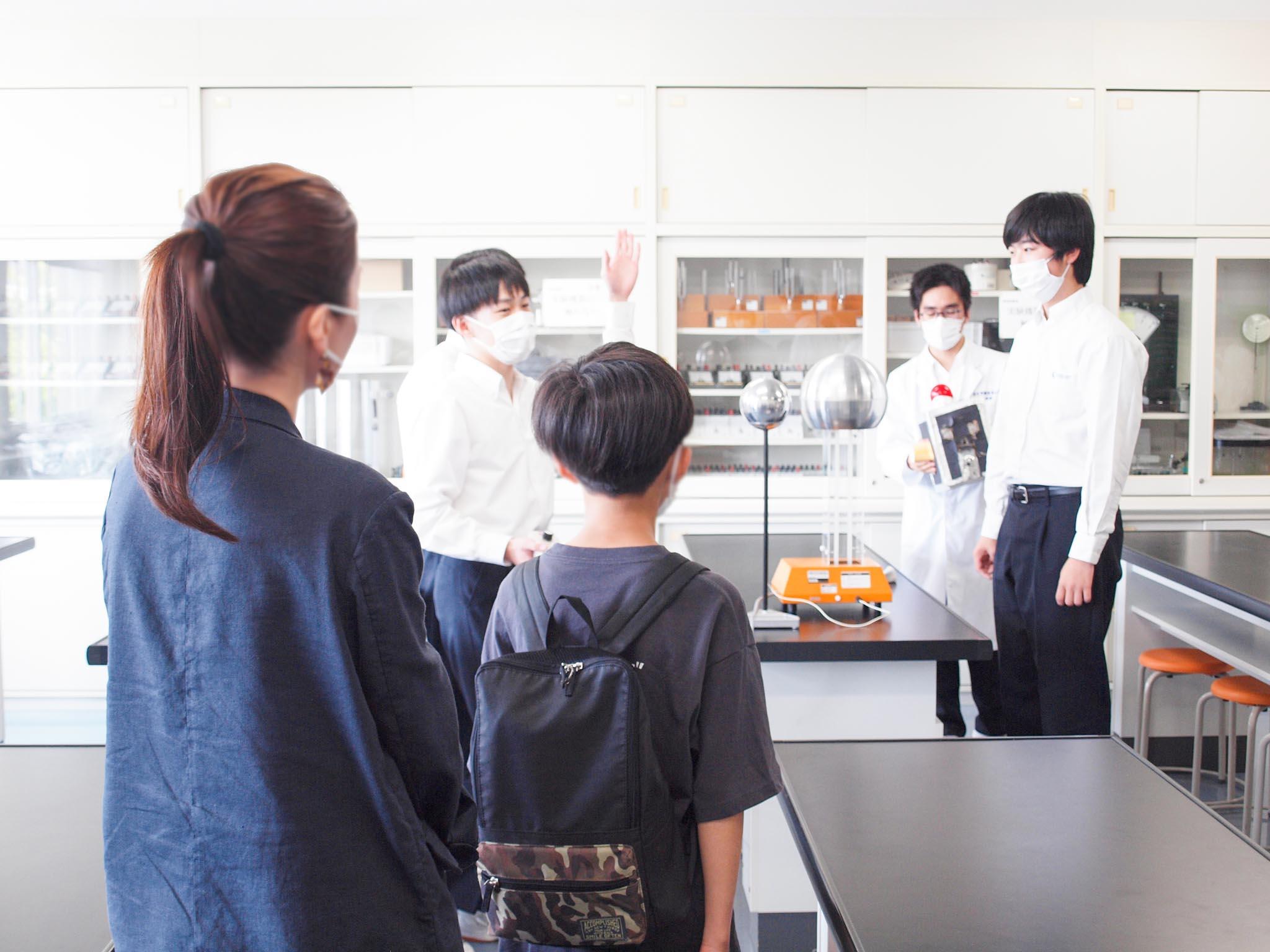 最初に天然芝の総合グラウンドを見ていただきました。校舎内では、科学部が静電気の実験のデモンストレーションを行い、参加者の皆さんは興味津々でごらんになっておられました。他にも、各ホームルーム教室、美術室、壁一面ホワイトボードでグループワークなどに使用できる探究ルーム、ライブラリーなどを見学していただきました。