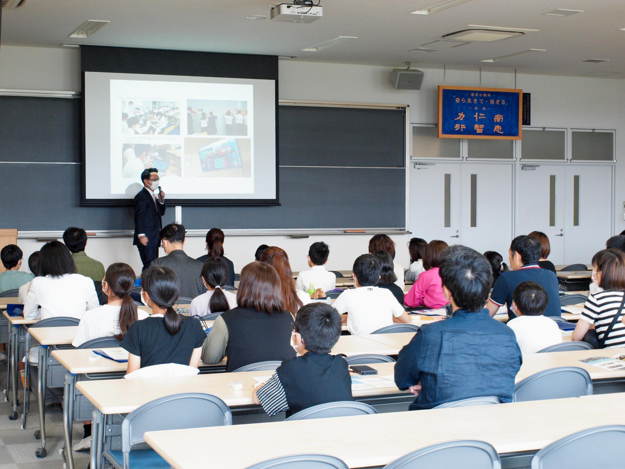 最初に安井校長が、「本校の学校経営スローガンとして『子どもの伸び率日本一を目指す』ことを揚げ、自由にチャレンジできる環境の中で、学びの力を生徒に寄り添いながら指導しています。10年後20年後を踏まえ、探究力や国際力をつけてもらい大きな夢に挑んでほしいと考えています」と挨拶しました。その後、スライドを見ていただきながら、学校生活の様子や宿泊研修、探究学習など本校の教育の特徴について話をしました。