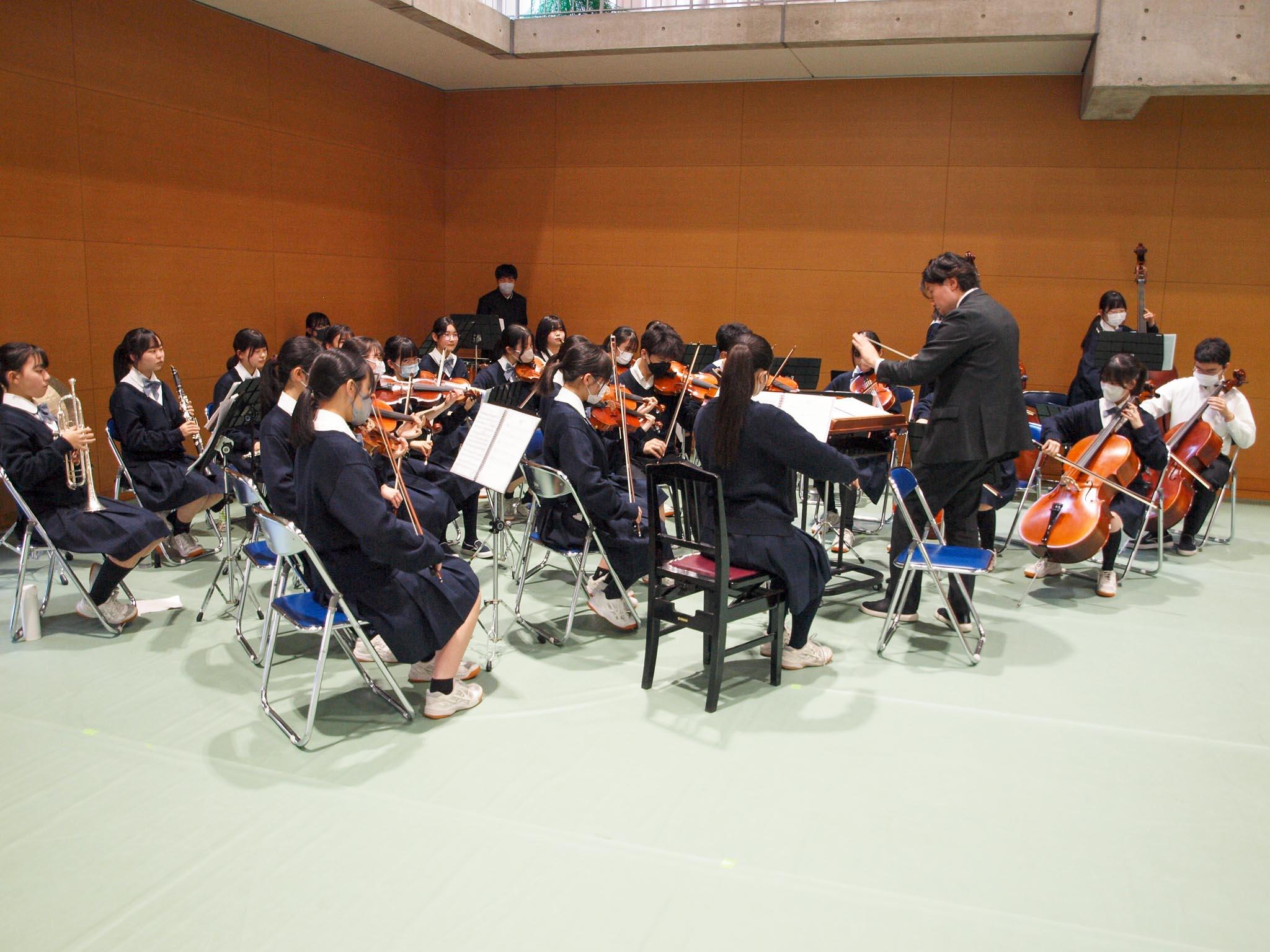 続いて新入生代表から、これからの中学校生活に向けての誓いの言葉が述べられ、在校生有志による校歌が本校室内楽部員の伴奏とともに披露されました。