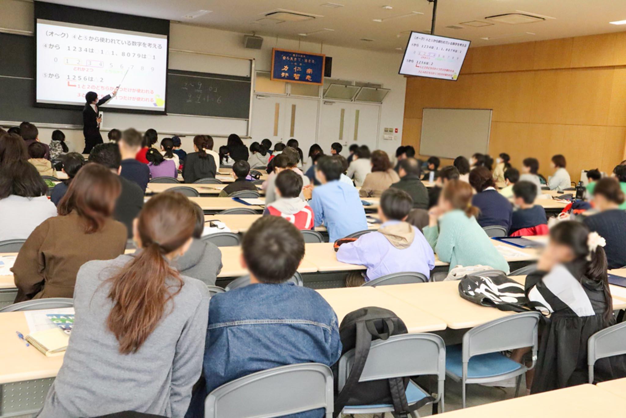 続いて、今年度の入試に実際に出題された算数の問題に取り組んでいただき、本校数学教員が解説しました。苦戦しながらも親子で一生懸命取り組んでくれました。