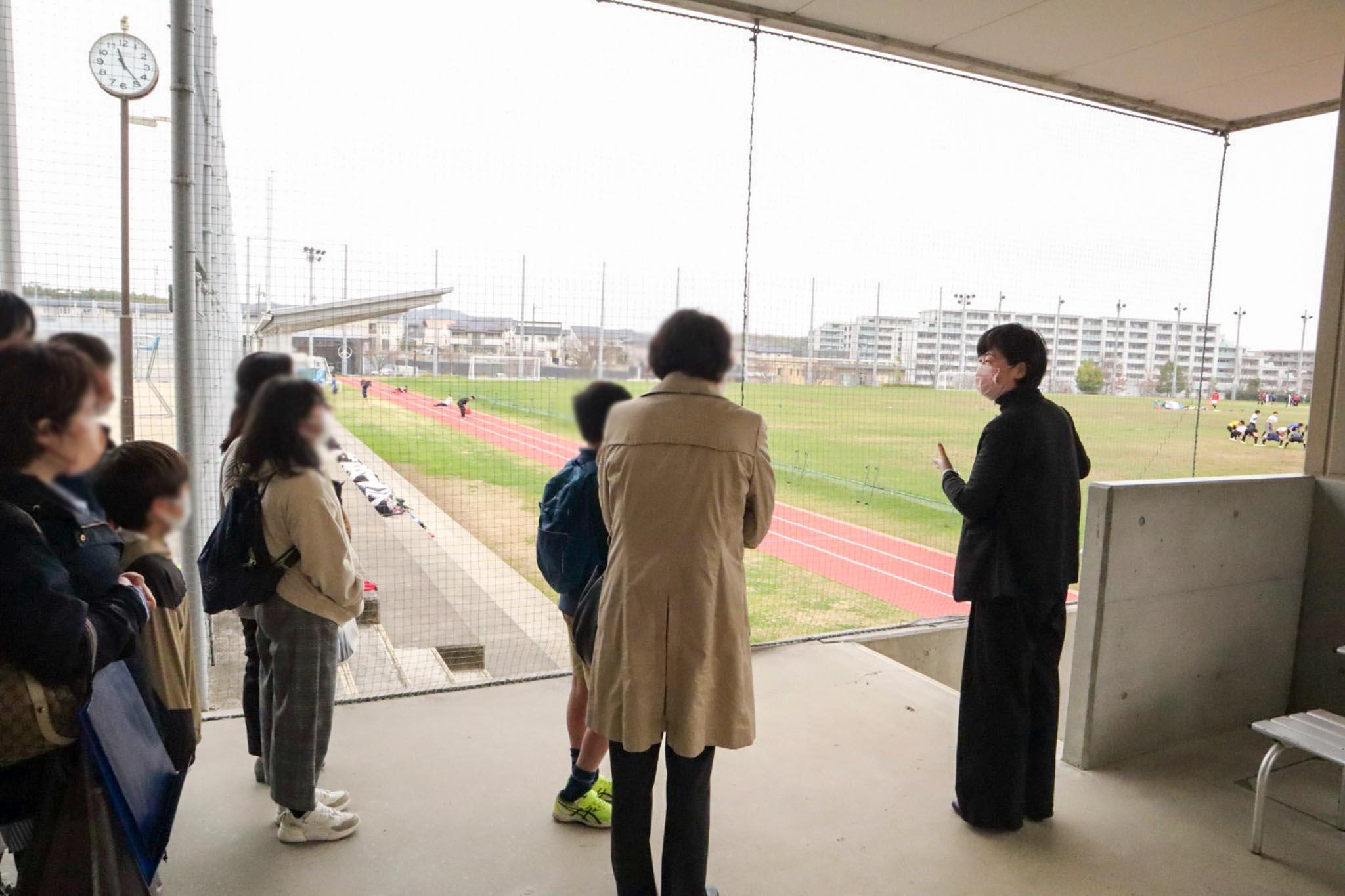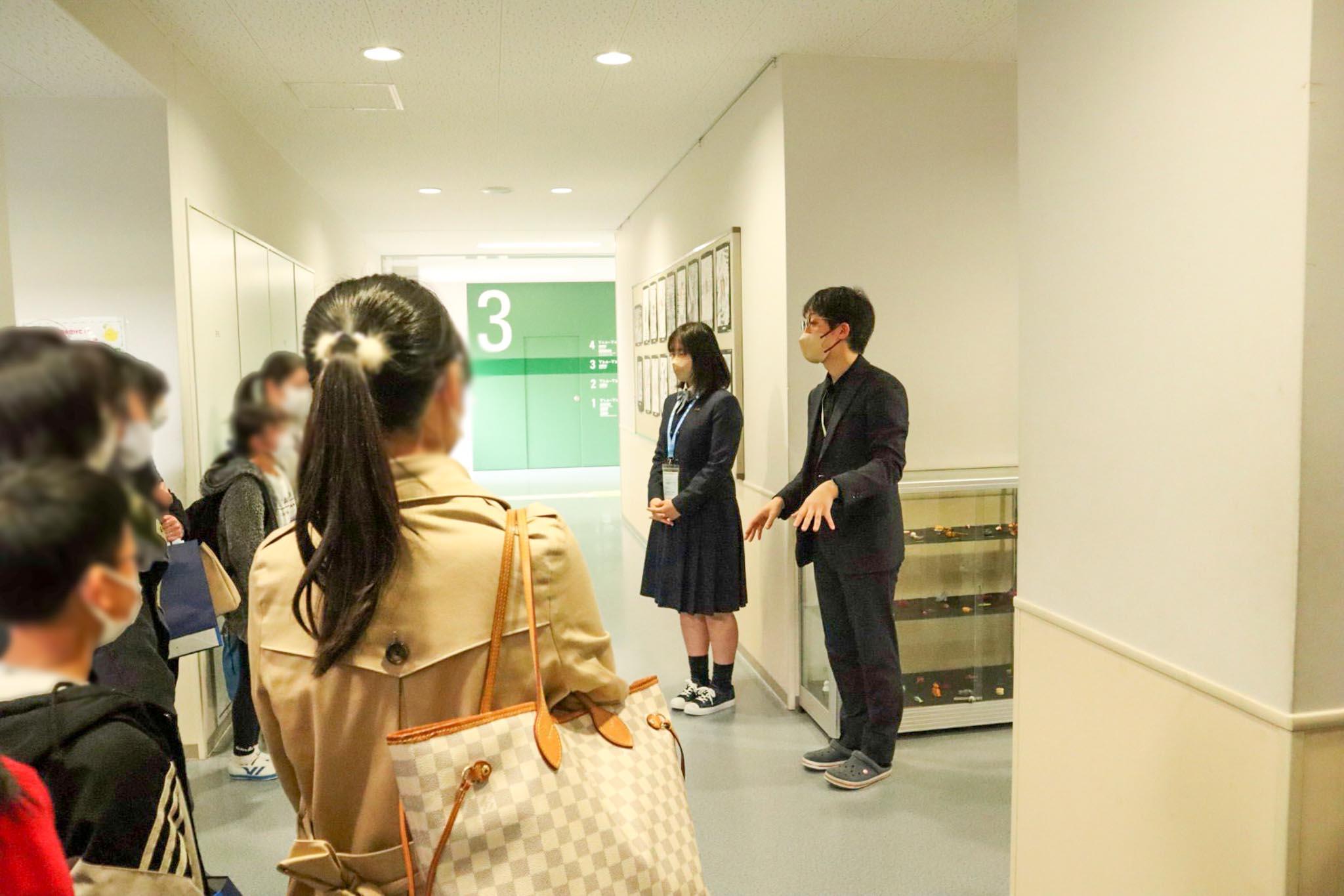 後半は、グループに分かれて校内見学を行いました。天然芝の総合グラウンド、6面あるテニスコートや体育館などを教員と在校生で案内しました。校舎内では、サイエンスホールや壁一面ホワイトボードでグループワークなどに使える探究ルーム、約3万6000冊もの蔵書があるライブラリーなどを見学していただきました。校内を巡る中で、本校に興味をもっていただいた保護者のみなさまからたくさんの質問をいただきました。