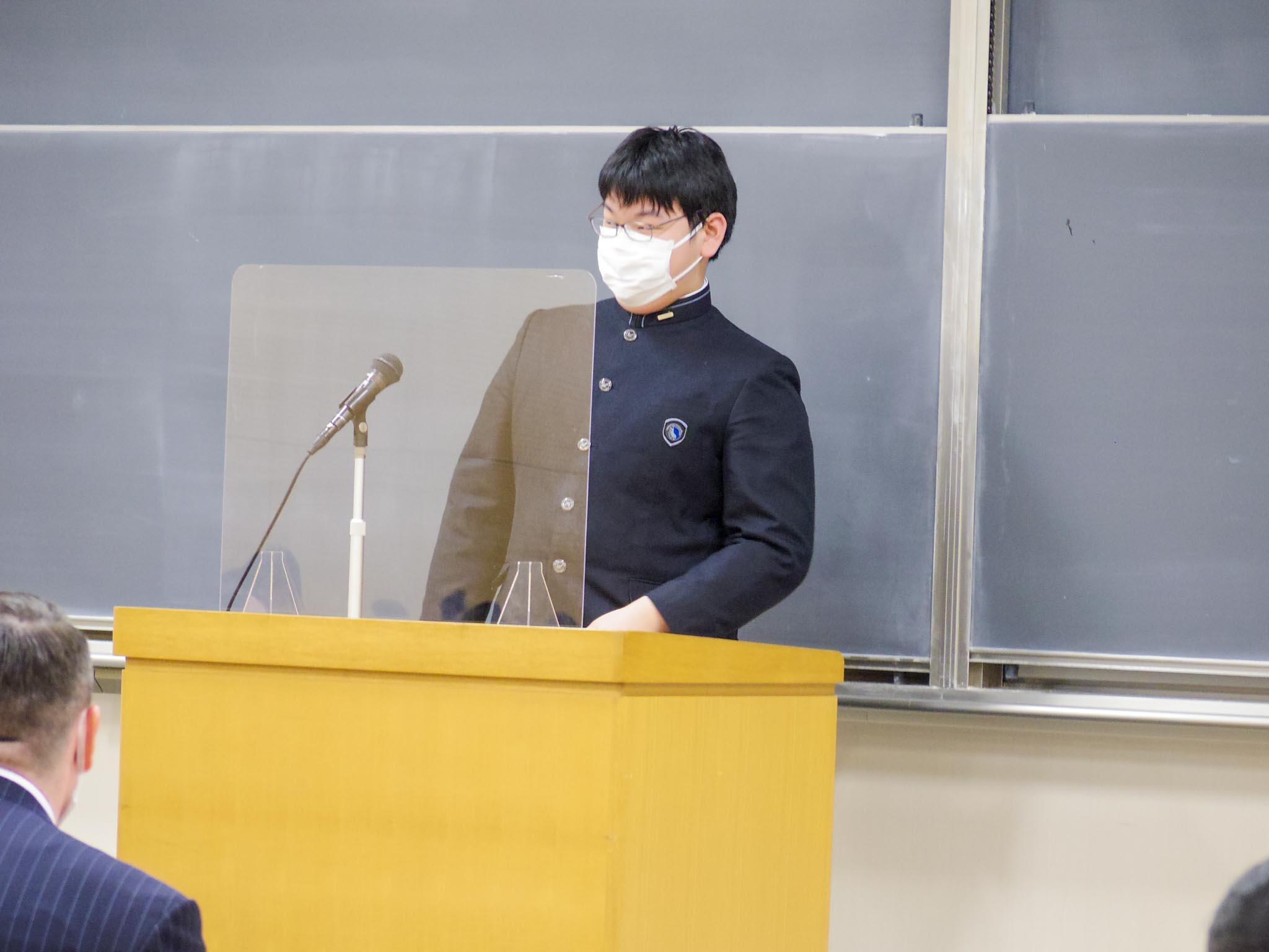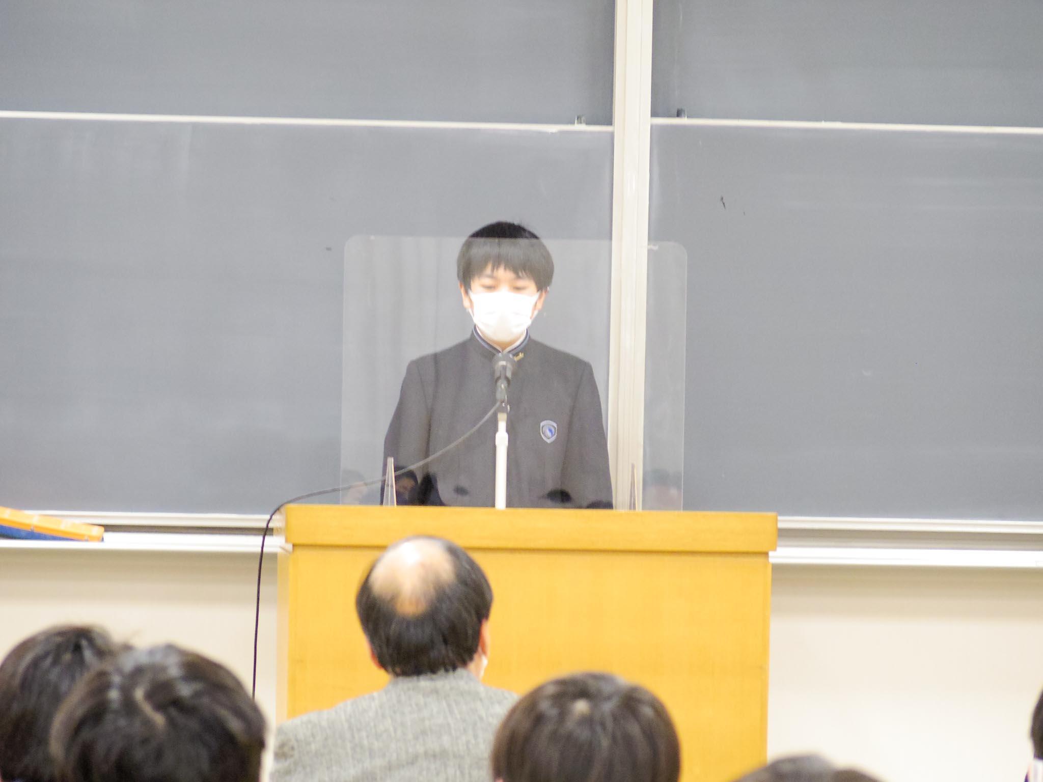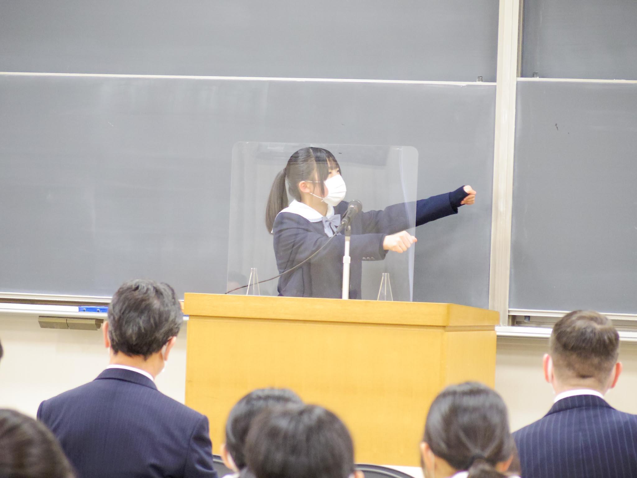 内容は全員同じですが、17名の生徒たちは練習を重ねて本番に挑み、それぞれのスタイルや演出で暗唱を行いました。マイクや演台を外して身ひとつで果敢に挑戦する生徒も登場し、会場は大いに盛り上がりました。