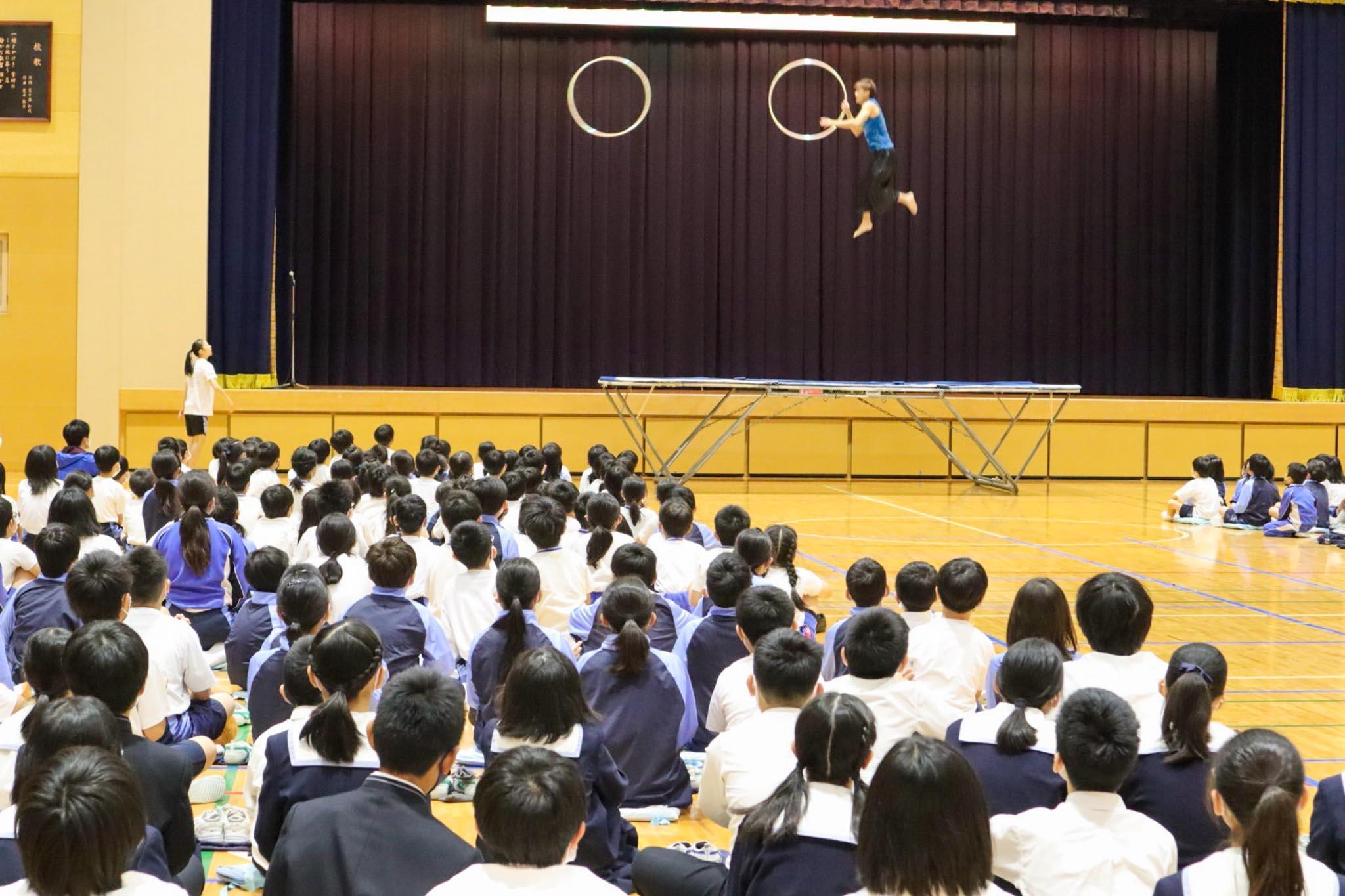 今回はバトントワリング、新体操、体操、トランポリンのアスリートたちが、空中を軽々と舞うバク転や、積まれた椅子の上で逆立ちをするパフォーマンスを披露。みんなから大きな拍手が沸き起こりました。