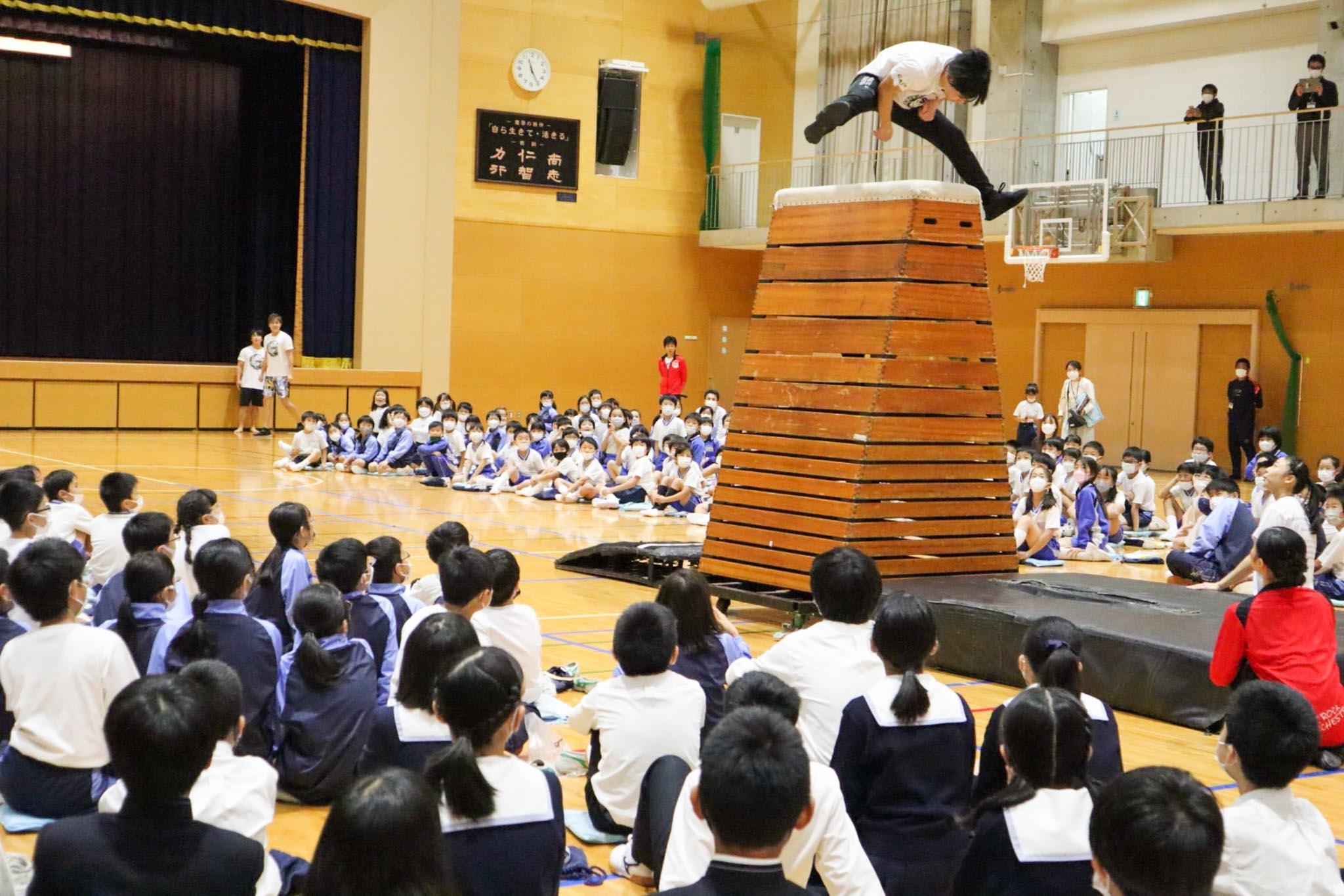 さまざまなパフォーマンスの最後は、跳び箱です。まずは、2人の児童が学校でいつも使う跳び箱より長い、競技用の跳び箱5段に挑戦し、クリア。みんなから大きな拍手をもらいました。続いて、SROの3人がなんと17段の跳び箱からスタートして、バトル開始。見事なフォームで19段を飛び越え成功した時には、盛大な拍手がおくられました。