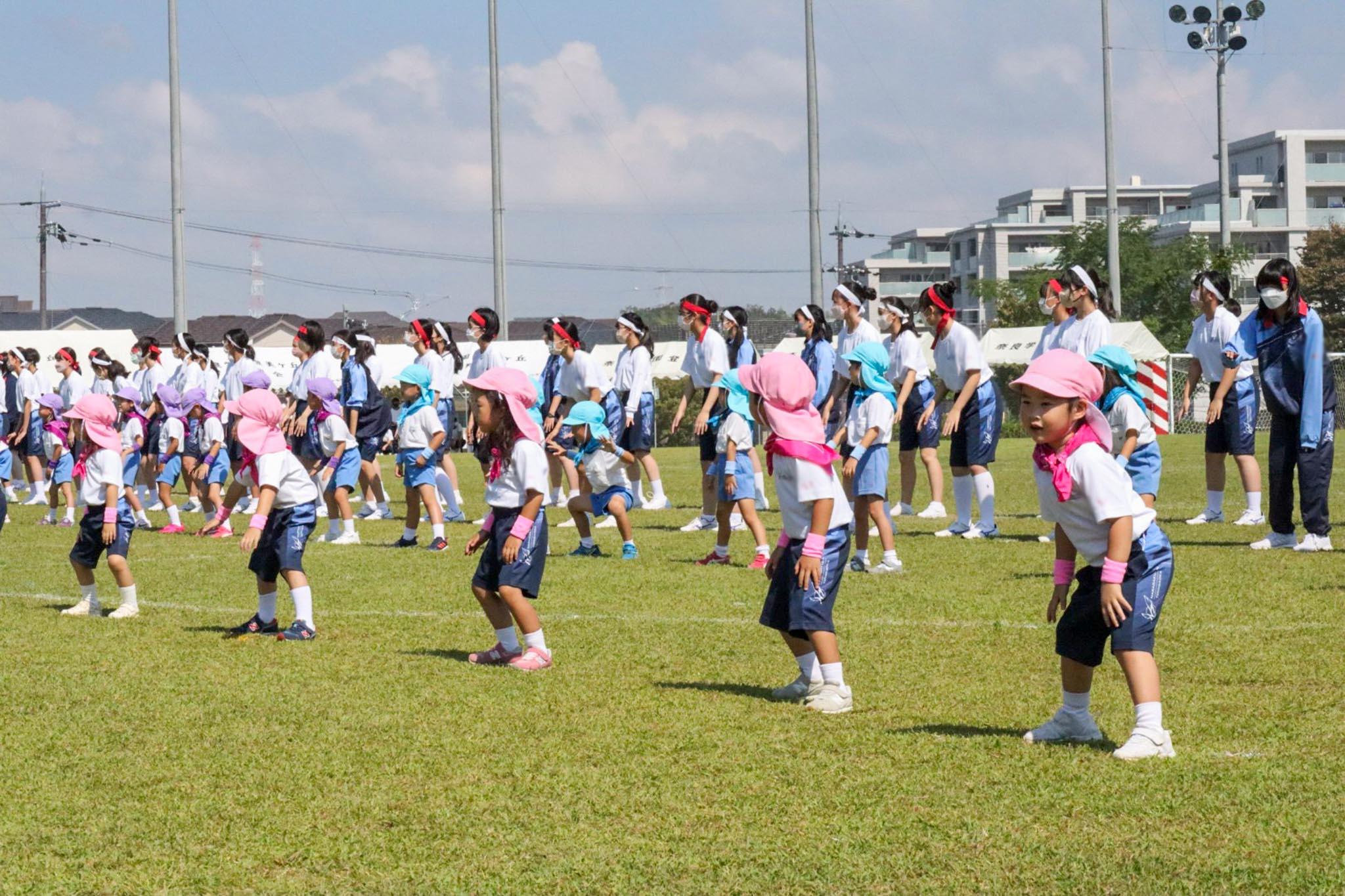 全員でのラジオ体操の後は、園児たちがM3生、Y2生の女子と合同演技「こころの花」を踊りました。演技を終えた後、園児たちがお姉さんたちと手をつないで退場する様子を見て、「まるで仲のいい兄弟姉妹が歩いているみたい」という、保護者の会話が聞かれました。