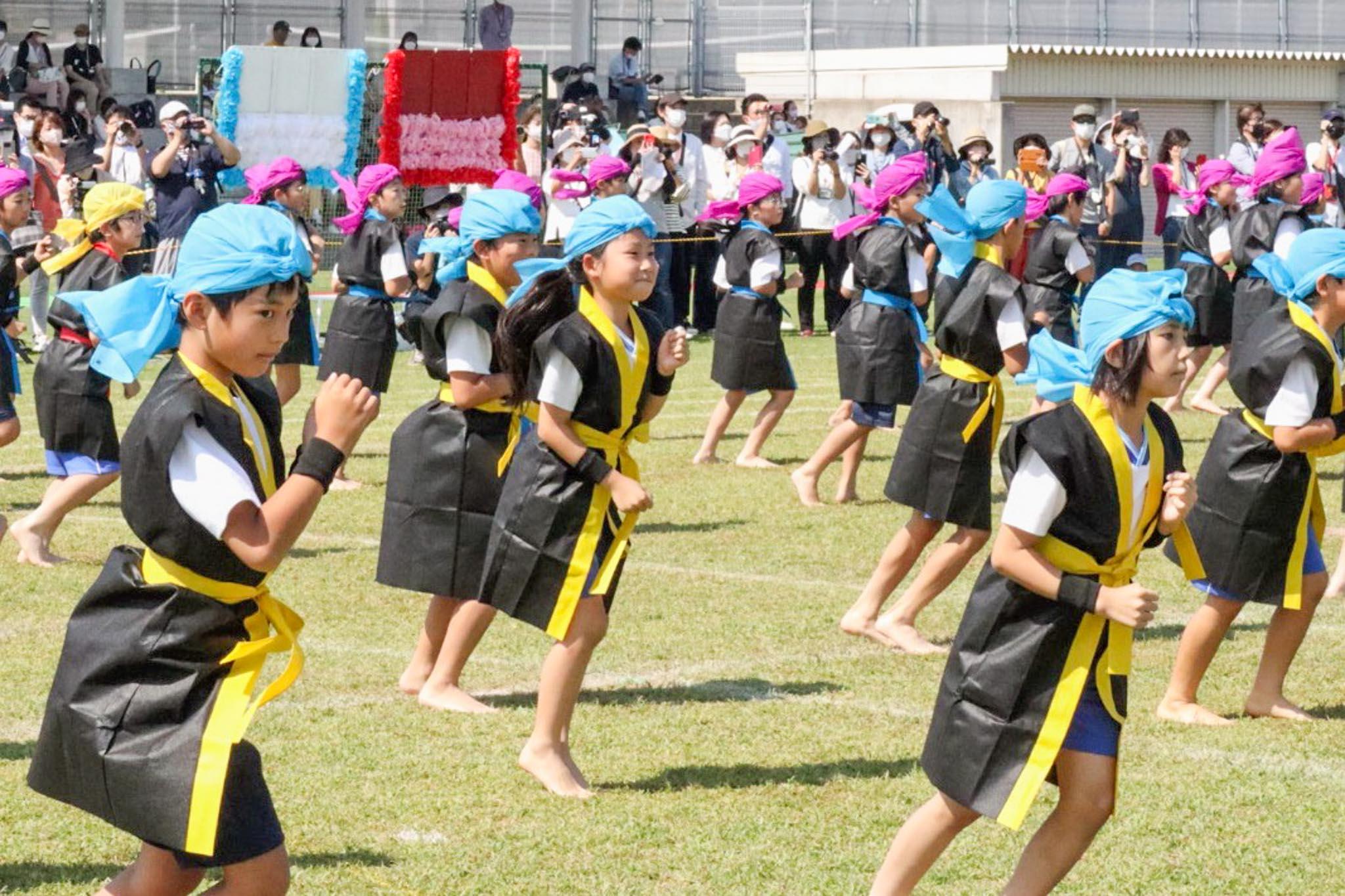 「ダイナミック琉球2022」で沖縄舞踏を踊ったP3生、P4生の力強い演技に、保護者席からはもちろん、子どもたちの応援席や先生方からもリズムに合わせて手拍子が起こりました。