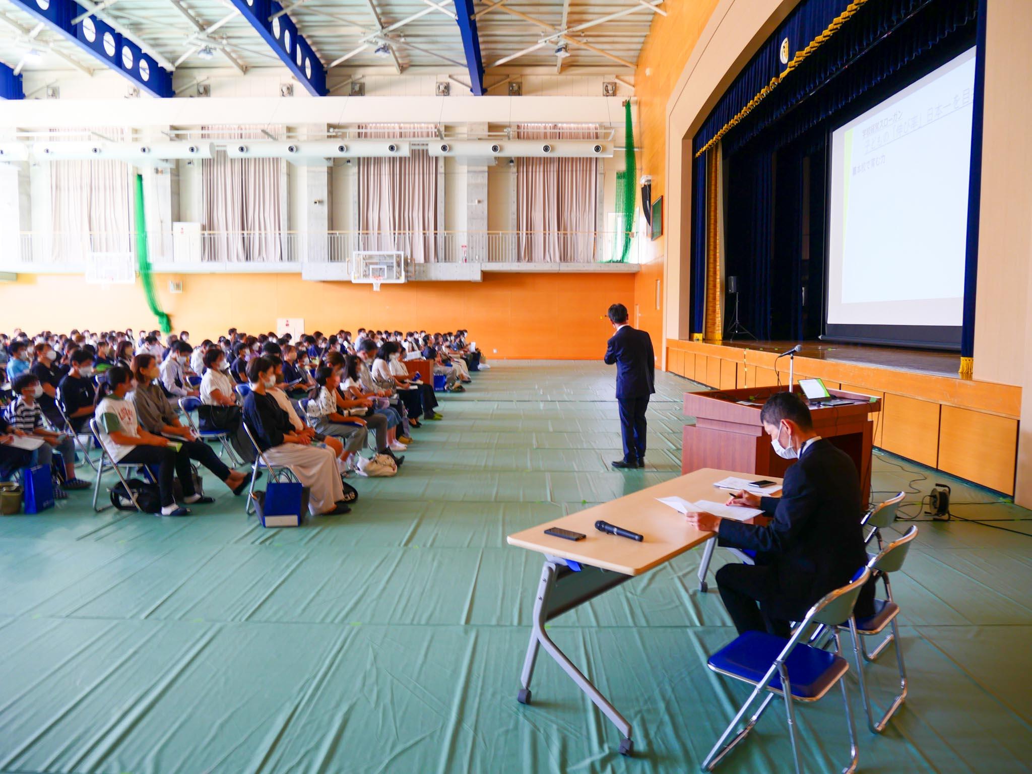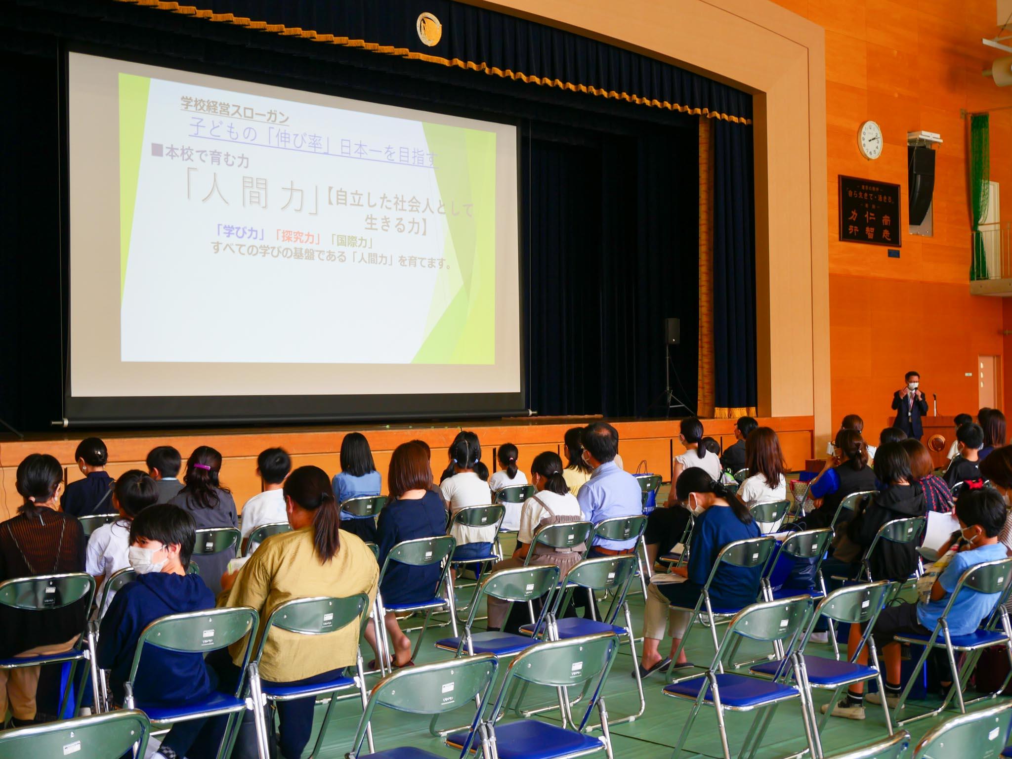 最初に、安井校長からの挨拶で学校経営スローガンとして「子どもの伸び率、日本一を目指す」ことを掲げているという話がありました。また、「探究学習」にも触れて、本校で育む力について語られました。広報部長からは、奈良学園登美ヶ丘の環境や教育内容、進学実績、学習サポートについての話がありました。