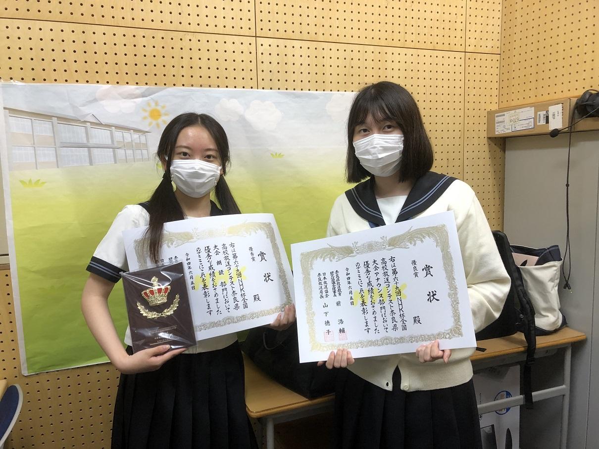 本校の放送委員会から出場したY4(高3)生が朗読部門で優秀賞を、Y3(高2)生がアナウンス部門で優良賞を受賞し、全国大会出場を決めた。Y4(高3)生の作品の世界を伝える朗読技術の高さは審査員からも高い評価を受け、Y3(高2)生のアナウンスは、爽やかで素直な読みが評価された。これまで二人は放送委員会のなかで校外の活動に参加する有志メンバーとして活動してきた。