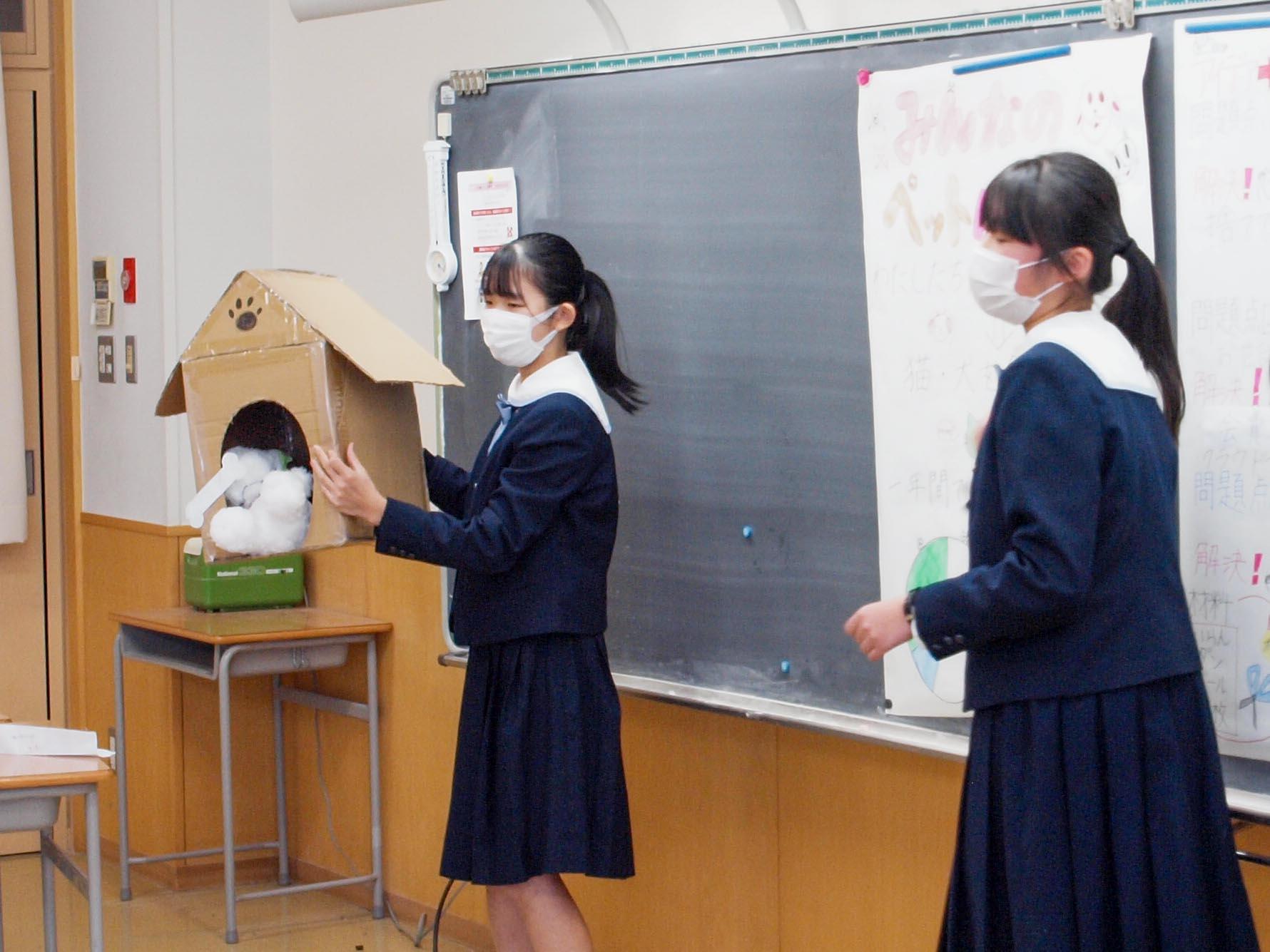M4(中2)の発表はポスターを使ったプレゼンテーションで、取り組んだテーマは「~な人を助けたい」です。「授業中に居眠りする人」、「よく怒る人」、「お財布が緊急事態宣言の人」など、身近な友達の課題を解決するものから、「いろいろな言語がわからない人」という、若者言葉がわからず世代間のギャップに悩む大人の課題解決のためのアプリの開発や、「ペットを飼えない人」のためのペットハウスをつくるアイデアなど、多彩な発表が行われました。