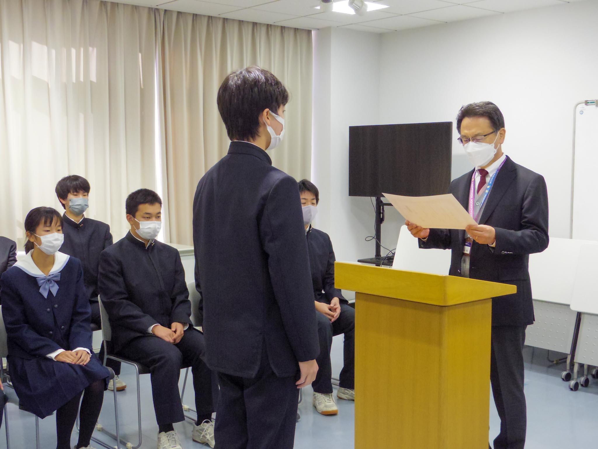 まずは安井校長が一人ひとりに任命証を授与し、第13代生徒会役員を正式に任命しました。各役員は、2021年度後期から2022年度前期の1年間を務めます。
