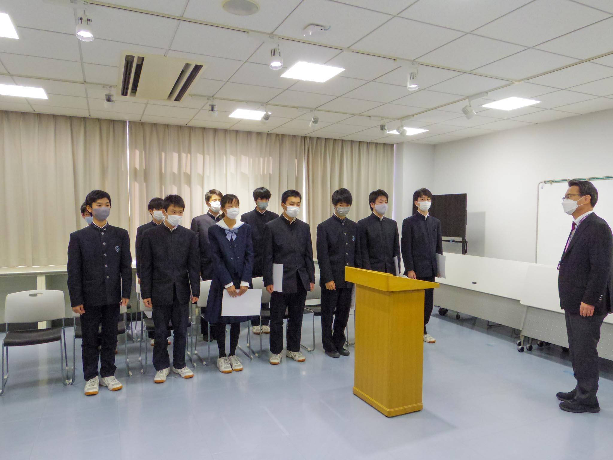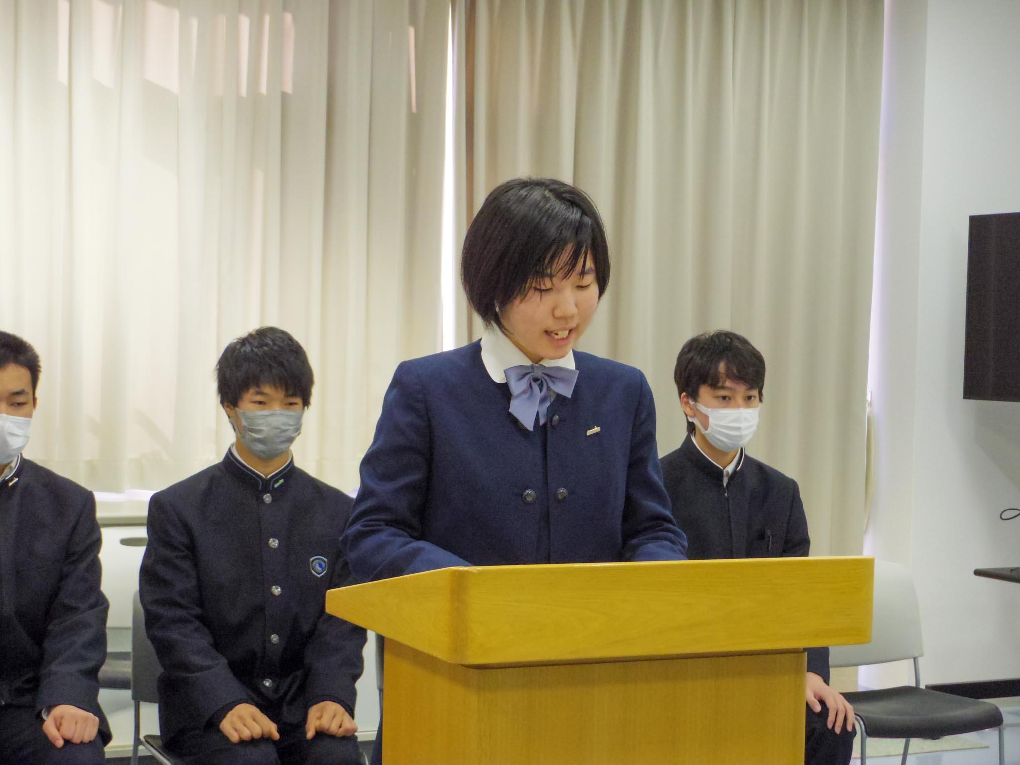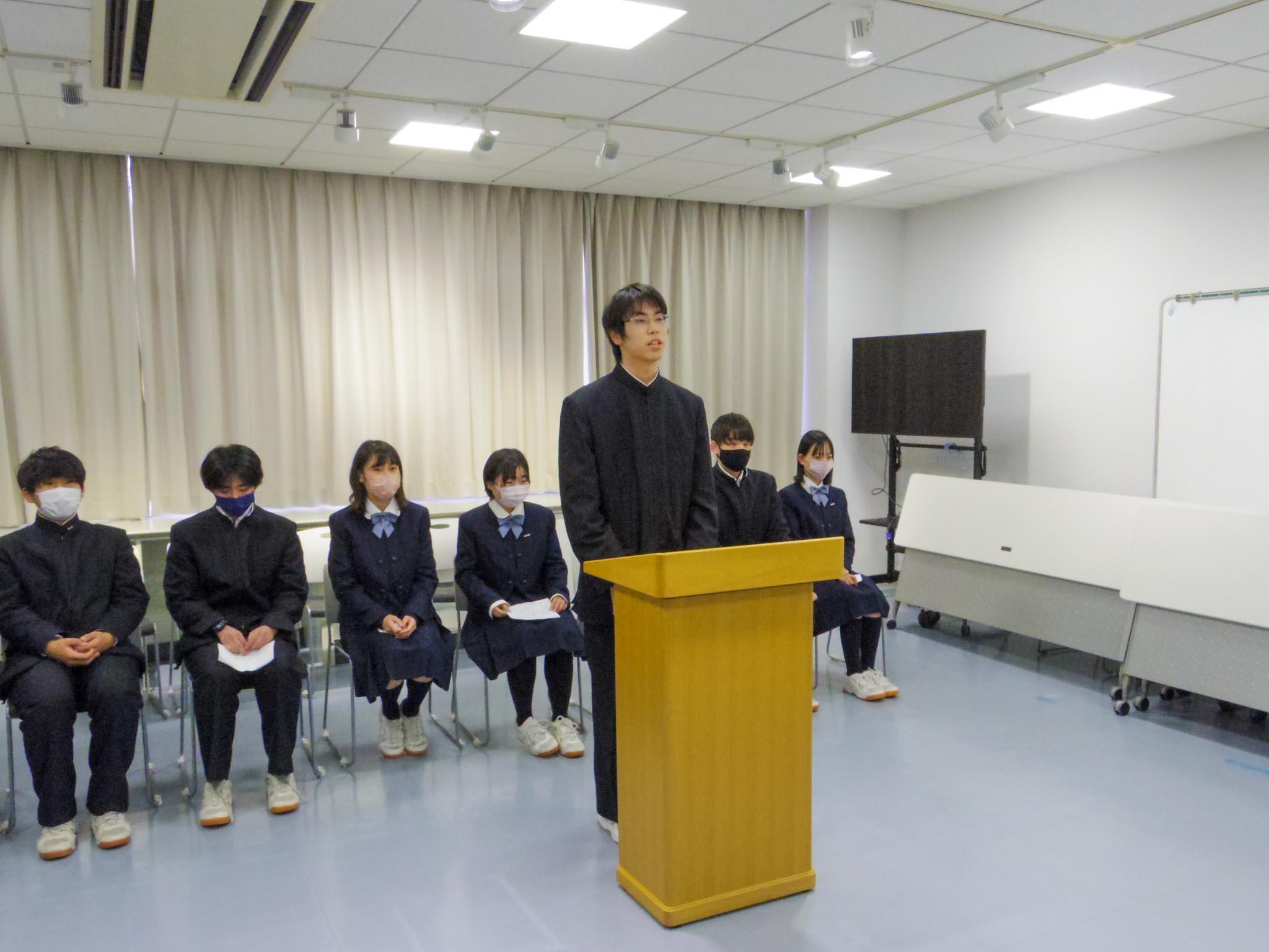 第12代生徒会長が退任挨拶を行い、執行部に在籍した4年間を振り返るとともに、生徒会の面々や教職員、全校生徒への感謝を述べました。続いて第13代生徒会長が就任挨拶で、伸び率日本一の学校を実現するために「主体性のある学校」をスローガンとし、コンテストや大会により参加しやすい環境づくりに取り組むと宣言しました。
