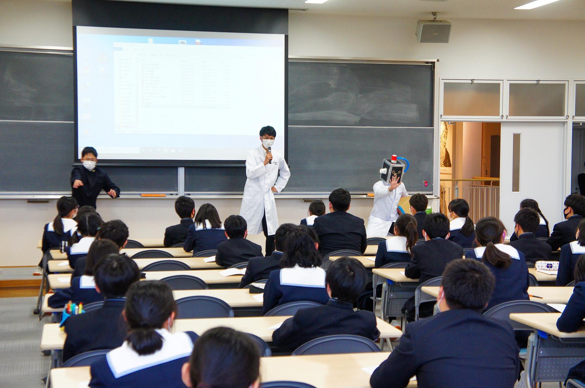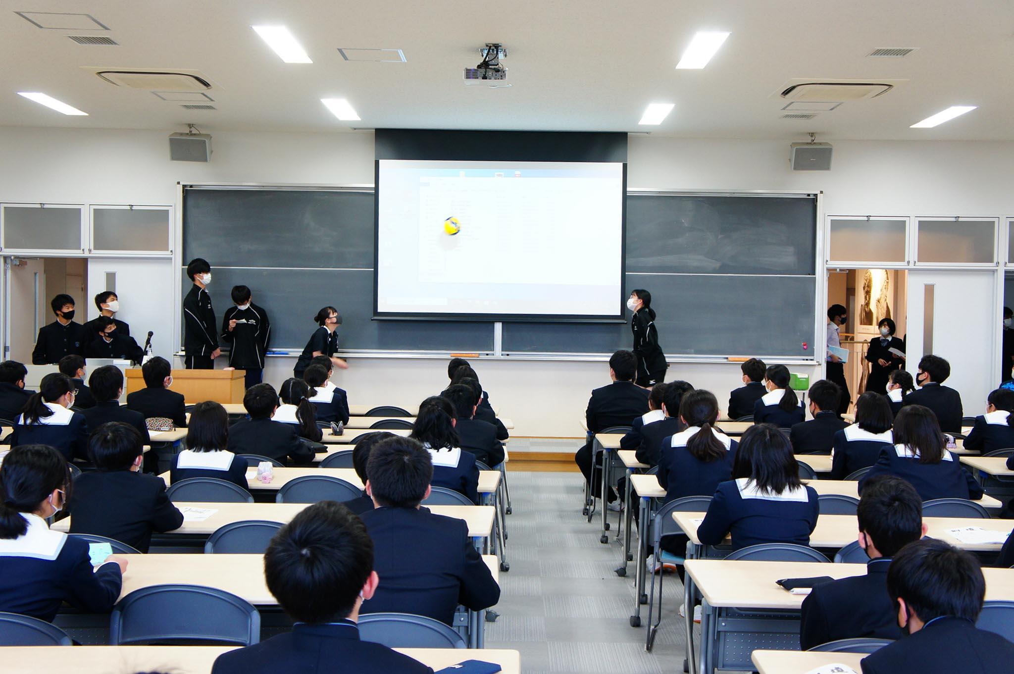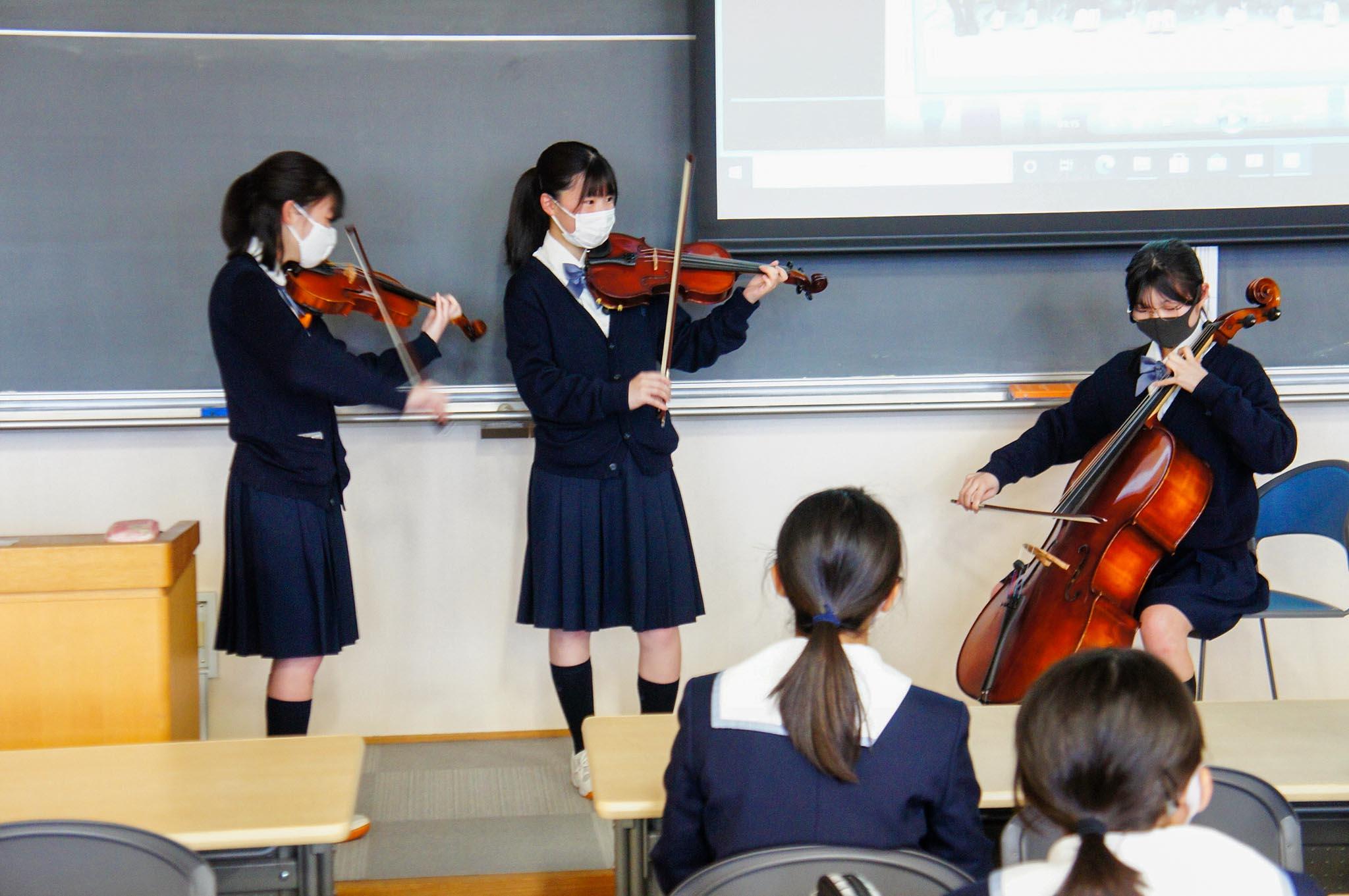 また文化部は、スライドや動画を活用しながらの発表を行ないました。演劇部はショートコント風のパフォーマンス、室内楽部はバイオリンとチェロのライブ演奏を行い、大きな拍手を受けました。茶道部は、「茶道部に入りたい人、手を挙げてください」と、会場での呼びかけも行っていました。
