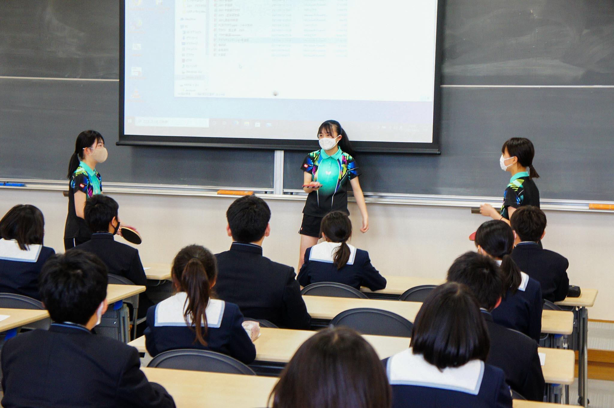各クラブ持ち時間1分の中で、クラブ紹介を行いました。運動部は、ユニフォーム姿で登壇。卓球部はピンポン玉リレー、バレーボール部はレシーブラリーを行うなど、各部工夫を凝らしたパフォーマンスを披露しました。