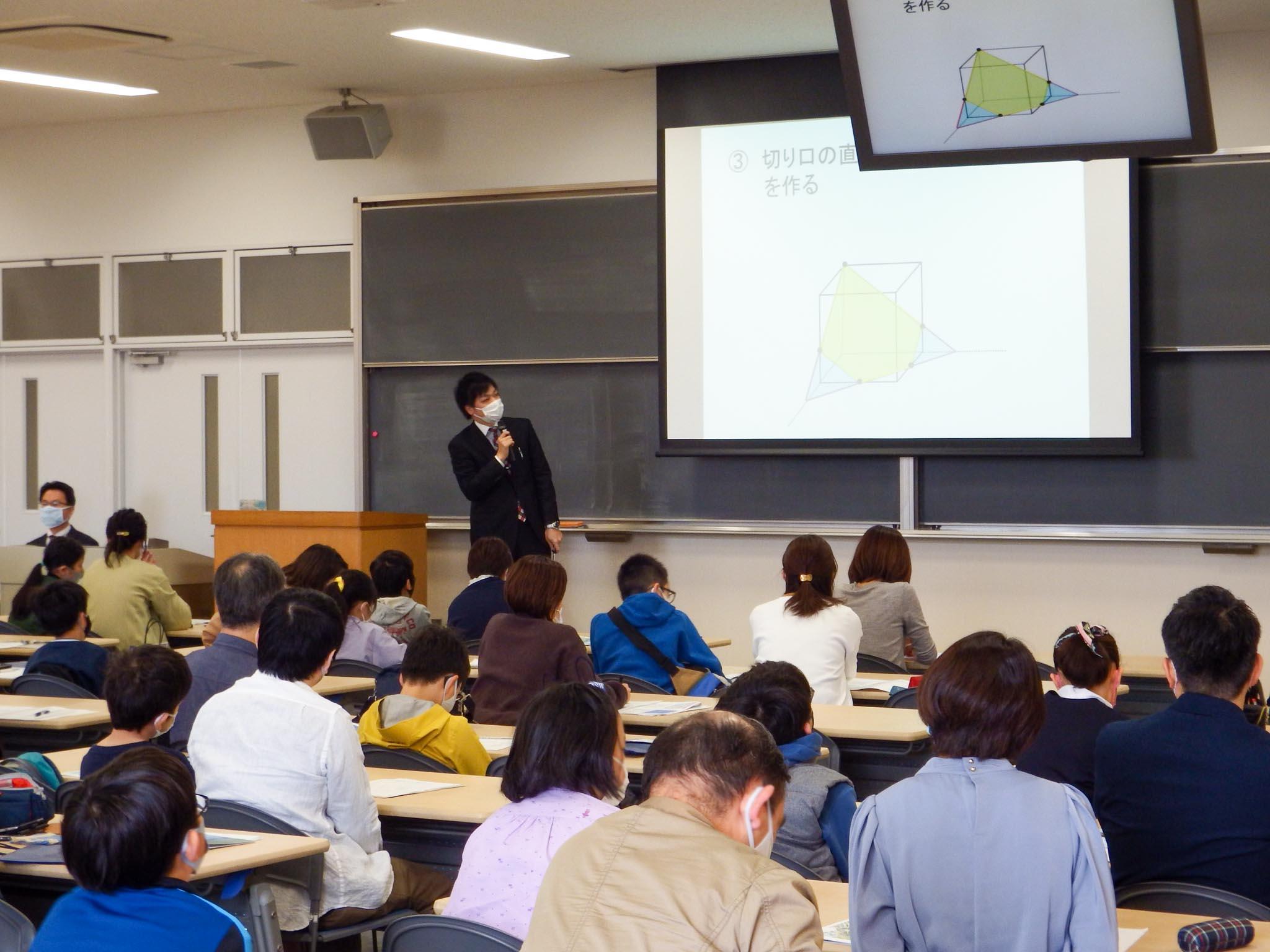 説明会の冒頭に安井校長から、「子供には無限の可能性がある。勉学や部活動に励んでほしい」と挨拶がありました。続いて、探究学習の取り組みや本年度の大学進学実績について説明しました。また、今年度の入試問題の解説も行いました。