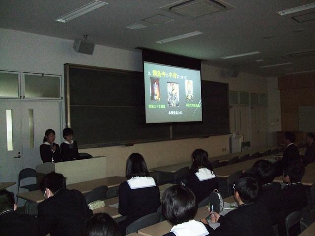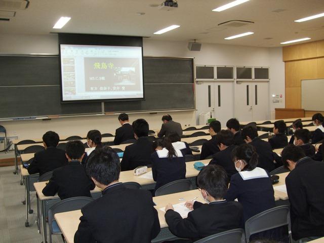 10月の飛鳥への社会見学で12箇所の史跡を巡りました。その後、事後学習として各班がパワーポイントを作成し、事前に調べたこと、現地で見たことなどをまとめ、発表を行うことになっています。12月に各クラスで予選会を実施し、上位に選ばれた班がこの本選に出場しました。他の生徒は司会・審査を行いました。