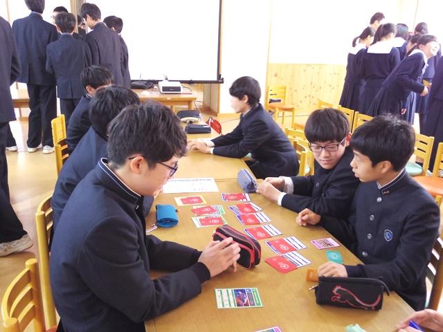 今回のワークショップでは、SDGsについて講師の方から教わった後、カードゲームを通じて理解を深めました。3人1組のチームを作り、自チームに配られた「教育の無償化」「交通インフラの整備」などのプロジェクトカードの達成を目指します。各世界の状態は「経済」「環境」「社会」のパラメータで可視化されており、プロジェクトが達成されると地球全体が影響を受けます。プロジェクトを達成するために必要な「時間」と「お金」、そして世界のパラメータの条件はカードごとに異なるため、ゲームを上手く進めるにはチーム同士の交渉が重大な鍵となります。限られた時間の中、生徒たちは互いのチームを行き来し、やりとりを重ねていました。