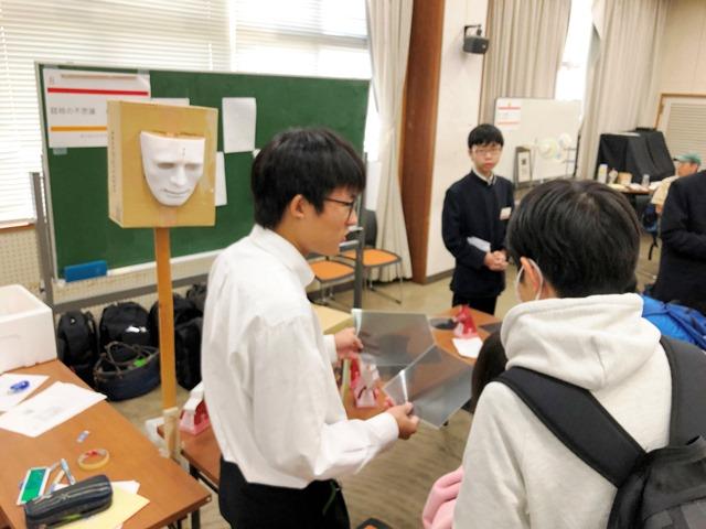 出展内容は「錯視の不思議」です。本来凹んでいる部分が陰影などの影響により立体的に見える”ホロウマスク錯視”や、のぞき穴を通して片目で見ると錯視を起こす”エイムズの部屋”、規則正しい繰り返し模様を複数重ね合わせた時に生じる縞模様である”モアレ縞(干渉縞)”を自分たちで作成した模型などを使って演示・説明をしました。