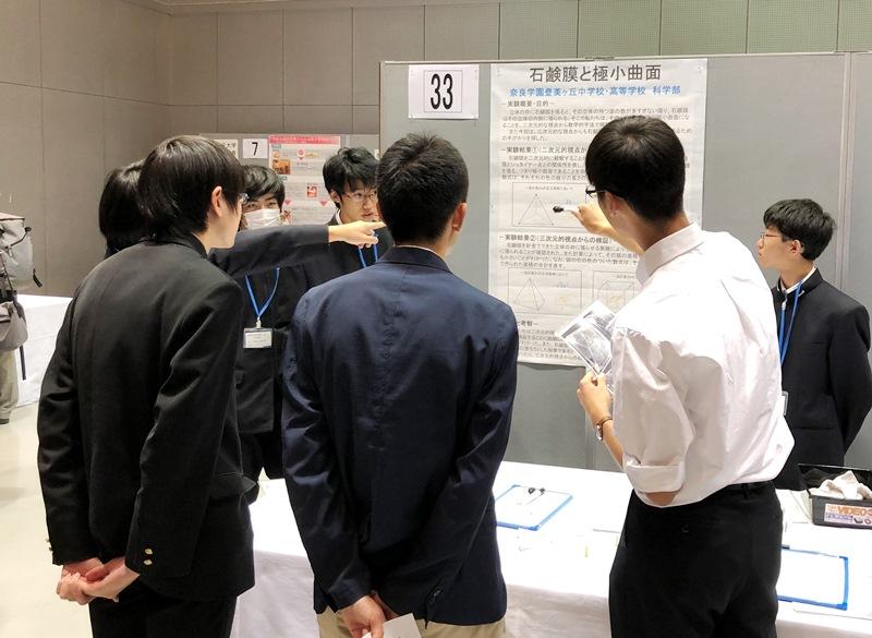 本年度の発表テーマは、「石鹸膜と極小曲面」。立体の枠に石鹸膜を張った際に、その膜が極小曲面になることを数学的手法により検証しました。多くの方にポスター展示を見ていただき、たくさんのアドバイスや激励をいただきました。ご来場いただきました皆様、ありがとうございました。