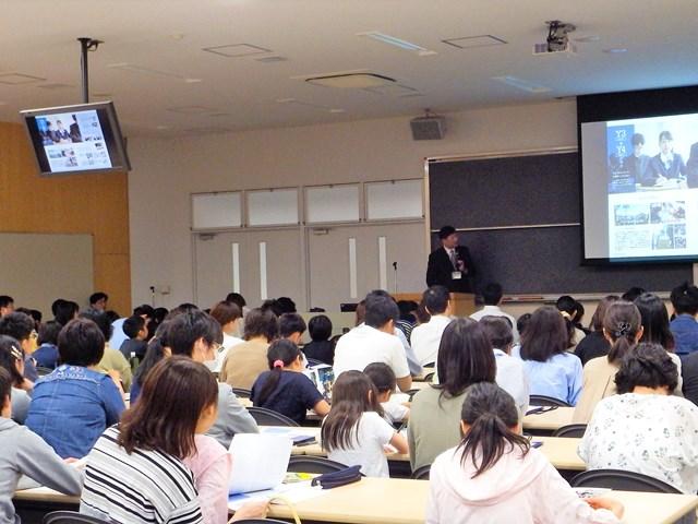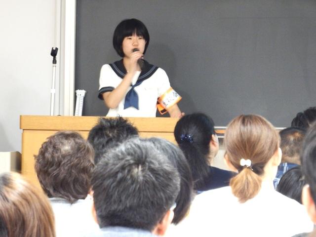 続いて広報部長から、本校の教育について中学、高校を通した6年間のプログラム、沖縄への宿泊研修や国際交流の様子などを伝えました。