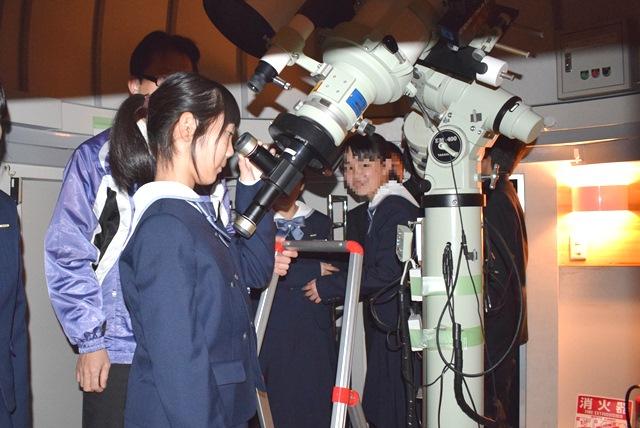 屋上に上がった生徒たちはまず担当の先生から、天体観測ドームの概要や冬の大三角形などが見える現在の空の様子について説明を受けました。そして実際にドームの中に入って天体を観望。月の表面や恒星のシリウス、ベテルギウスを見ました。