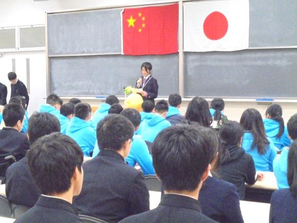 歓迎会では、古川謙二校長の挨拶の後、本校の生徒が英語で挨拶を行い、中国の生徒は英語や日本語を使った挨拶をしてくれました。