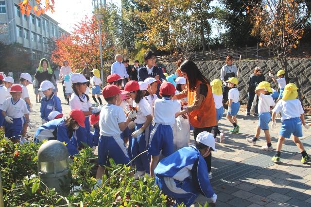 クラス毎に割り当てられたブロックに分かれて、清掃をします。園児は正門から続くプロムナードを中心に、保護者の方々と一緒に草を抜き、落ち葉拾いをしました。P生は校内や出入り口付近の道路、MY生はキャンパス周辺から通学路まで、草引きや落ち葉拾い、道路に落ちたゴミ拾いを行いました。集積場にはゴミ袋が山積みされ、キャンパス周辺は見違えるように美しくなりました。