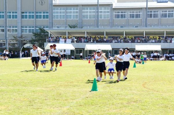 プログラムの始まりは、「奈良登美弾」。幼稚園年少から高校2年生までの園児、児童、生徒約1,200名が「Can’t Take My Eyes Off You(君の瞳に恋してる)」の曲に合わせて踊ります。その後、「綱取り合戦」や「騎馬戦」が行われた頃から、雲行きが怪しくなり、突然の雨のために、体育の日でもある2日後に延期となりました。