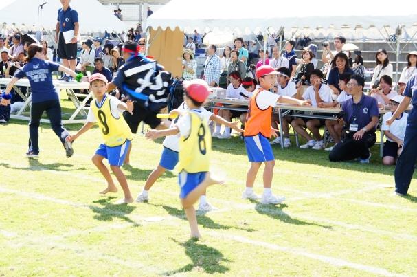 最後のプログラムは全学年に加え教職員チームも参戦するスウェーデンリレーです。PP1 (年少)の第1走者から始まり、バトンを幼小中高とつないでいく白熱のリレーです。最初はリードを保っていた教職員チームも、子どもたちの学年が上になり始めると競り始め、リードを奪われていました。白熱した戦いに観客から熱い応援が送られていました。