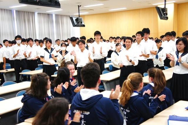 古川校長の挨拶の後、続いてアクワイナス・カレッジ生から、「私たちが皆さんとここにいる間、私たちにいっぱい声をかけてください。日本語でも英語でもかまいません。私たちはこの学校に来ることができて、とても嬉しいです。」と日本語で挨拶がありました。