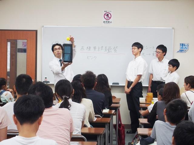 「体験授業」は本校の理科教員指導のもと、科学部の部員たちにも協力してもらい、「光の特性を知って、万華鏡を作ろう」というタイトルで、参加者に方々に紙コップを使った万華鏡作りを体験してもらいました。
