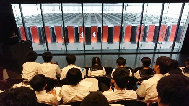 午後からは,最も楽しみにしていた理化学研究所計算科学研究センターを訪問しました。そこには,世界に誇るスーパーコンピュータ『京』があります。はじめに施設1階の展示スペースを見学し,6階にある見学者ホールでお話をお伺いしました。計算科学研究機構の役割,『京』の特徴,建物の耐震構造などについて詳しい説明を聞きました。その後,ホールの正面スクリーンが上がり,計算機筐体がずらっと並んだ『京』本体が姿を現すと,部員たちから歓声があがりました。