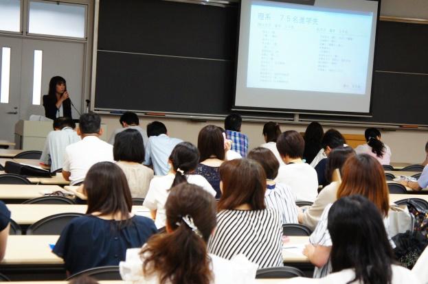 最初に、昨年度Y4(高3)生担当教員より、2017年度の大学入試結果について報告がありました。まず、本校の進路指導は、本人の意志・希望を尊重することを基本としていることを伝えました。そして、第1志望への進学を果たした生徒たちの学校での取り組みの様子を紹介しながら、目標を早くから定め、学校での授業や講習をしっかり活用すること、学校生活や行事に積極的に参加し楽しむことが大切であるという話をしました。