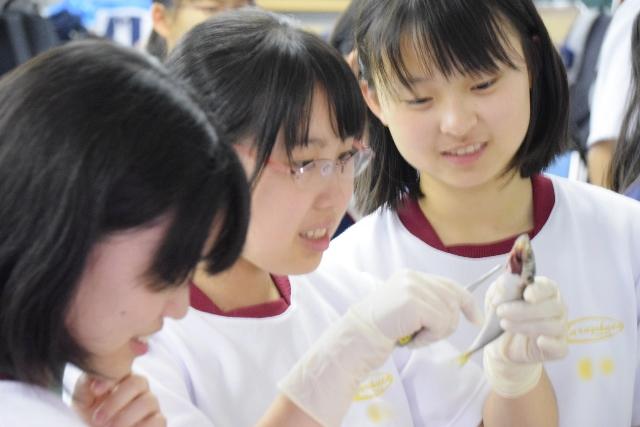 初日から三日目は、クラス単位で「近畿大学水産研究所での実習」・「南方熊楠記念館・京都大学白浜水族館の見学」・「三段壁・千畳敷の見学」・「(株)ウメタの梅干館(みなべ町)でのオリジナル梅干し作り・梅ジュース作り」・「学級活動(多くのクラスが白良浜へ散策に行きました)」をローテーションして実施しました。特に近畿大学水産研究所での実習は、生け簀で養殖されている魚を間近で見ることができたり、アジにいる寄生虫を実際に解剖して取り出したりすることができたりするなど、非常に貴重な体験をすることができました。