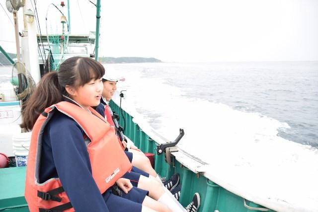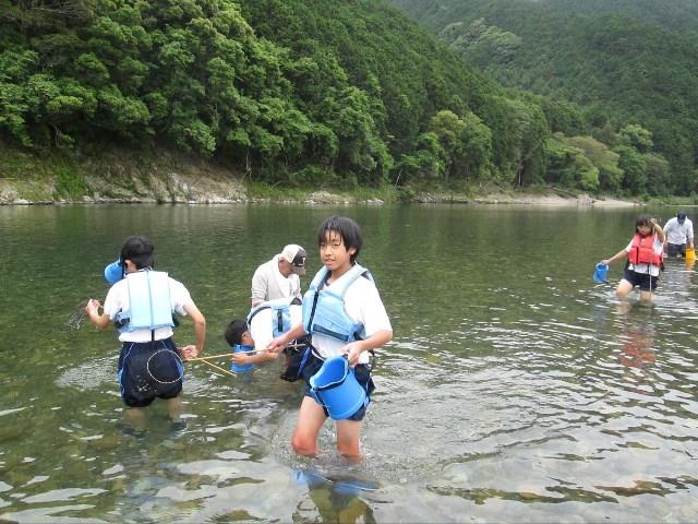 四日目は日置川町を中心に実施する「ほんまもん体験」でした。事前に「磯釣り」・「川釣り」・「川エビ漁」・「ジオトレッキング・クルージング」・「藍染め体験」・「備長炭風鈴作り」・「磯観察・エビカニ水族館見学」から選択した体験プログラムを各地で実施しました。川エビ漁は川に入ってエビを捕まえ、その場で油で揚げてもらって食べました。ジオトレッキング・クルージングでは漁船に乗って沖合まで行き、海から独特な地形を観察しました。