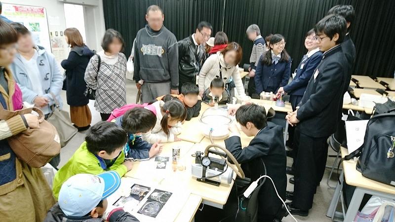 本校の出展は、物理学に関連した「地球から空気が消えたなら」の発表・演示実験でした。ゴム風船、花びら、マシュマロ、コーヒー缶などさまざまなものを、真空ポンプにつながったデシケーターにいれ観察しました。来場して下さった皆様方には、実験後の予測をしてもらってから目の前で起きる現象を楽しんでいただきました。また、この日のために2mの真空砲を本校科学部員が製作し、真空砲の実験を行いました。ものすごいスピードでピンポン球が飛び出し、空き缶に衝突した際の衝撃音と破壊力に来場者皆様から歓声があがりました。ご来場頂きました皆様方、ありがとうございました。