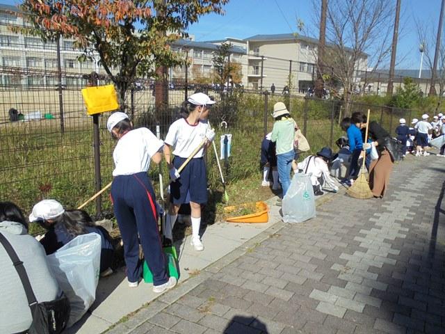先にグラウンドに集合していた保護者の方に、小学校の梅田真寿美校長が「ふれあい清掃を通して、異学齢のふれあいはもちろん、親子、そして、地域の方とのふれあいも感じていただければと思います」と挨拶し、登翔会役員から清掃にあたっての注意点などの説明を受け、清掃作業を開始しました。