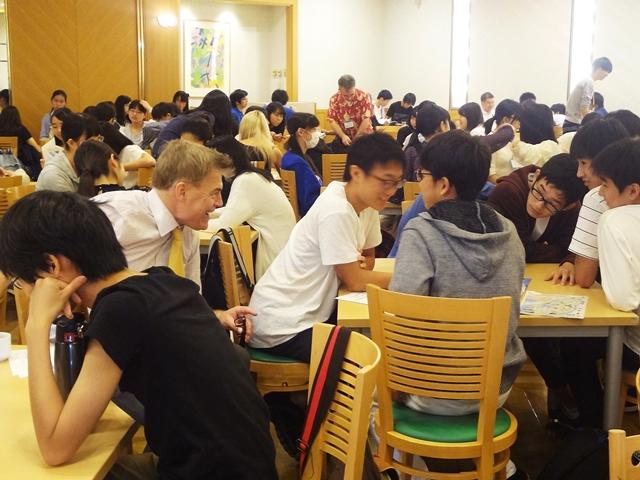 初日は、オープニングセレモニーを行ったあと、グループごとに分かれて講師の先生と昼食をとり、レッスンに入ります。最初は緊張して、なかなか話をすることができなかった生徒たちですが、講師の先生方が話しやすい雰囲気を作ってくださり、徐々に笑顔も見られるようになっていきました。2日目にもなると、引率教員に話しかける時も英語を使ったり、友達同士でも英語で会話をしたりと積極的に英会話を楽しむことができていました。
