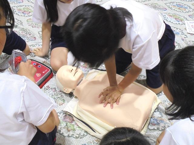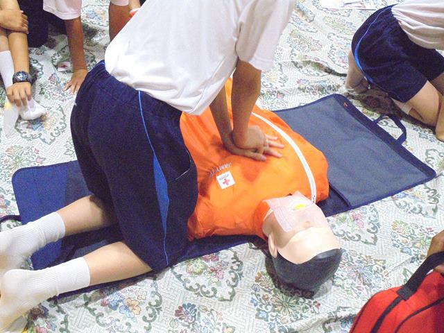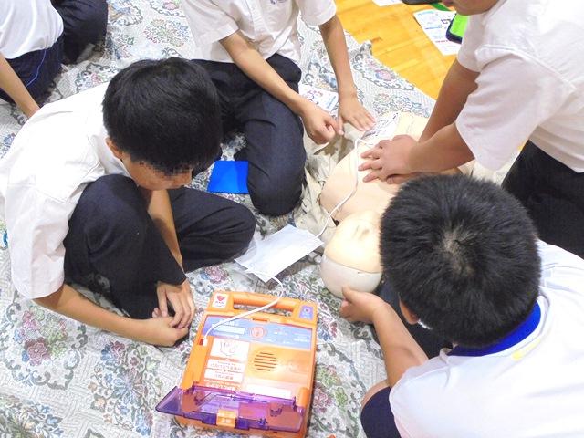 まず、手当の基本を教えていただきました。その後、心肺蘇生法の訓練用人形を使って、実際の処置を体験しました。生徒たちは少人数のグループに分かれ、胸骨圧迫や人工呼吸のやり方、AEDの取り扱いなどを体験しました。