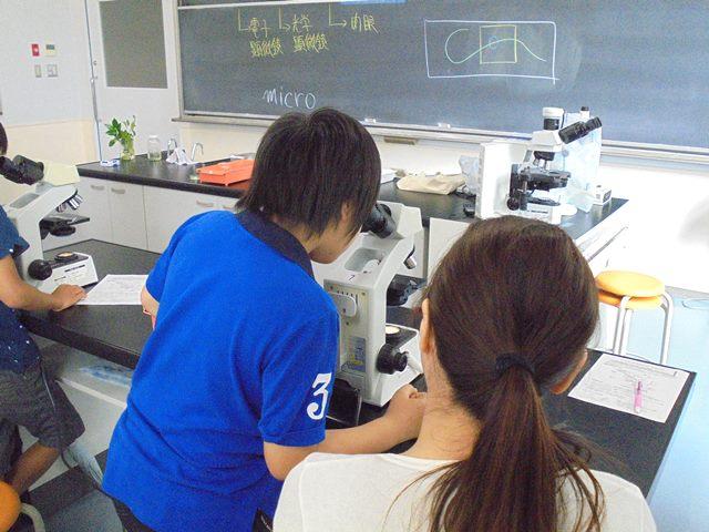 理科の実験は3つのテーマを用意し、それぞれ実験室で実施。例えば「ミクロの世界をのぞいてみよう!」は光学顕微鏡でアオミドロを観察する内容でした。顕微鏡で見るだけでなく、先生の説明をノートに熱心に書き写す児童もいて、楽しく実験をしていただけたようです。
