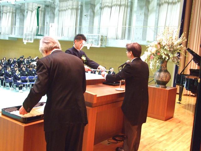 卒業証書授与式では、式台の上で待つ古川謙二校長が、卒業生一人ひとりに「おめでとうございます」と声をかけ、卒業証書を授与しました。その後、クラブ活動や学業で優秀な成績をおさめた生徒たちや、6年間皆勤した生徒たちへの表彰も行いました。