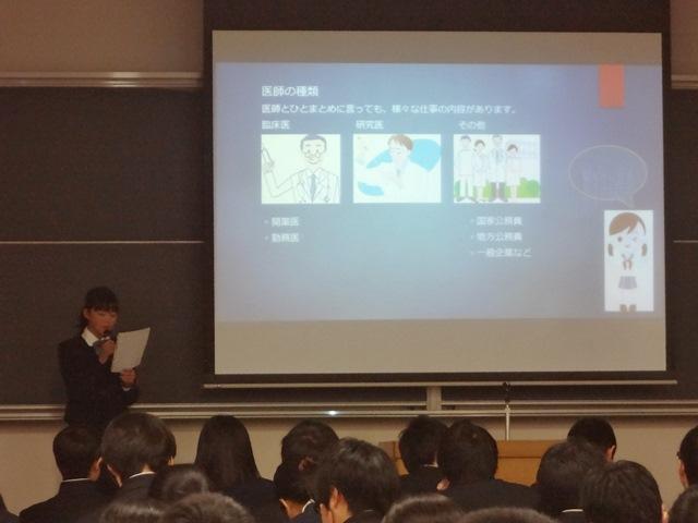 期末考査終了後からの、わずかな準備期間の中でいかに工夫して伝えるか、生徒たちは試行錯誤しながらの作業となっていましたが、M3(中1)学年から使い慣れたパワーポイントを上手に使い、分かりやすくまとめてくれました。生徒たちにとって、今回の発表会も将来について考える良い機会となったと思います。