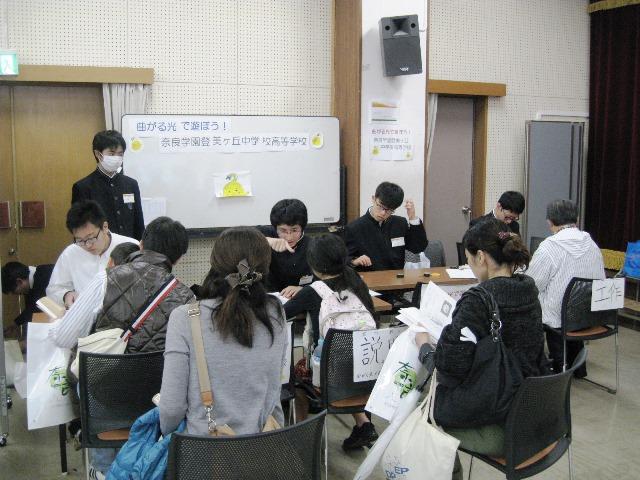 光ファイバーは、光通信を行うときに使用される極細繊維です。本校科学部は、この不思議な光ファイバーをつかって屈折の原理を説明し、その後、来場された方と一緒に工作を楽しみました。