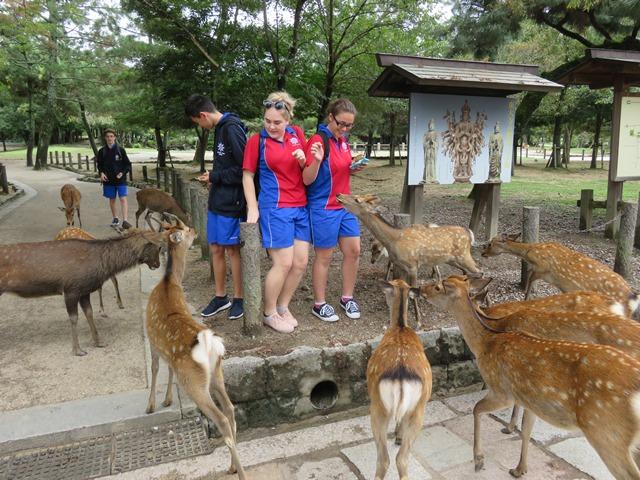 奈良での初日は、奈良公園、東大寺の散策からスタートしました。たくさんの鹿に囲まれ、歓声(悲鳴?)をあげたり、大仏殿の壮大さに驚いたりと奈良の文化の一端に触れてもらいました。その後、本校へ来校し、Y2(高1)中心の歓迎セレモニーを受けました。予定時間を大幅に超えるほど盛り上がり、楽しいセレモニーとなりました。