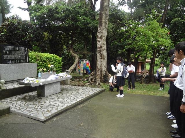 初日は平和ガイドさんの案内のもと、平和学習を重点的に行いました。白梅の塔で宿泊研修委員長が平和の誓いを述べ、私たちの学びの姿勢を確認した後、平和の礎、南風原文化センターを見学、壕の中にも入り、当時の人々の苦しみ、無念さに思いを馳せました。