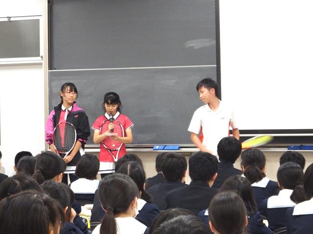 それぞれユニフォームを着て、ボールやラケットを手に、練習日や時間、練習内容、部員数などを紹介。スライドを使ってQ&A方式で説明したり、「初心者、大歓迎です」「礼儀作法や反射神経を養います」など、ポイントを的確に伝える工夫をしていました。