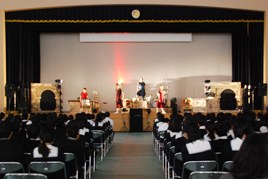 11月24日、中学1年生(M3)と2年生(M4)の生徒を対象に芸術鑑賞会を開催しました。「劇団わらび座」より「パフォーマンスバンド響」の皆さんにお越しいただき、MY体育館で「走れメロス」を上演しました。