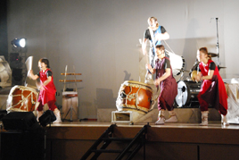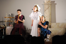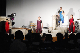 この演目は、生徒たちもよく知る太宰治の「走れメロス」の物語に和・洋の楽器や歌、ダンスのパフォーマンスを盛り込み、場面の状況や登場人物の心境を力強く表現したものです。4名の役者で多数の役をこなし、テンポのよい場面転換に生徒たちは物語の中に引き込まれました。”信じる”ことに自分と親友の命を懸けて走るメロスの姿を表現した舞台に、生徒たちは強いメッセージを読み取ってくれたことでしょう。