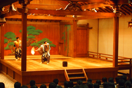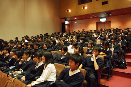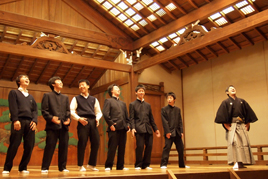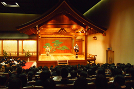 11月19日、中学3年生(Y1)と高校1年生(Y2)対象に芸術鑑賞会を行い、大阪市大槻能楽堂で狂言を楽しみました。鑑賞の前に舞台の仕組みや演目説明があり、能の体験では各クラスから1人ずつ能舞台に上がって姿勢や独特の笑い方、泣き方、台詞の言い回しなどを教わりました。 |
