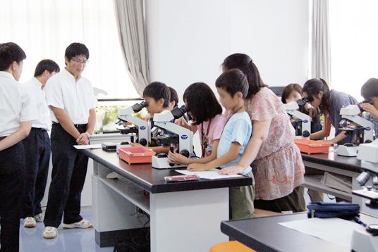 『生物』では「ミクロの世界」をテーマに、光学顕微鏡でミドリムシやゾウリムシを観察。参加者は小さな生物の動きに見入っていました。『物理』では「おもちゃの世界」をテーマにコピー用紙3枚で「ブーメラン」を作り、体育館で飛ばしました。参加者から「ブーメランが物理に結びつくとは思っていませんでした。こうして勉強への好奇心を引き出すのですね。良い方針だと思います」と、本校の「学ぶ」姿勢を評価していただきました。