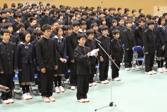 在校生から歓迎の言葉を受けた後、新入学生を代表してM3の平田賢吾くんが探検家の周到な準備に勝利があるという言葉を引用し、「中学は大人になる準備期間。勉強に部活に励み過ごしたい」、Y2の新留一輝くんは「高校3年間でしっかりと自分を見つめ、中学1期生として悔いのない3年間を過ごす」とそれぞれ力強く宣誓しました。